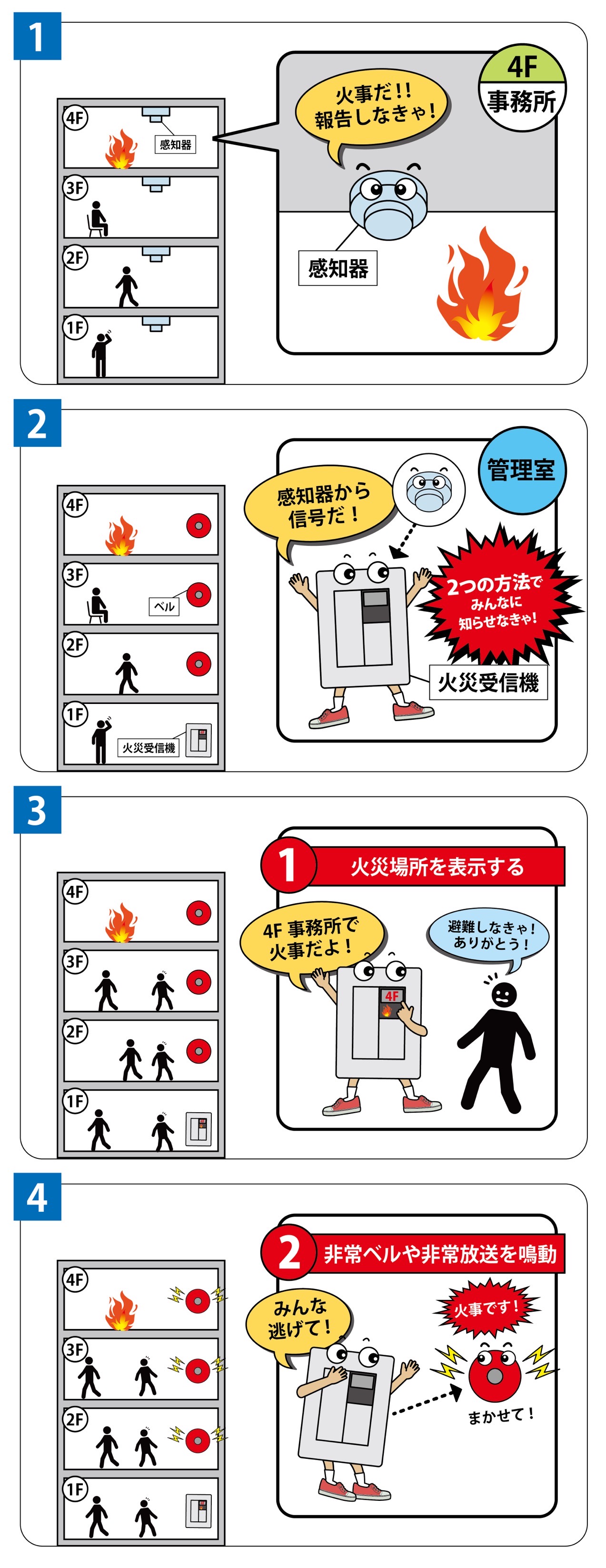 建物全体に火災を知らせるために、非常ベルや非常放送を鳴動させます。